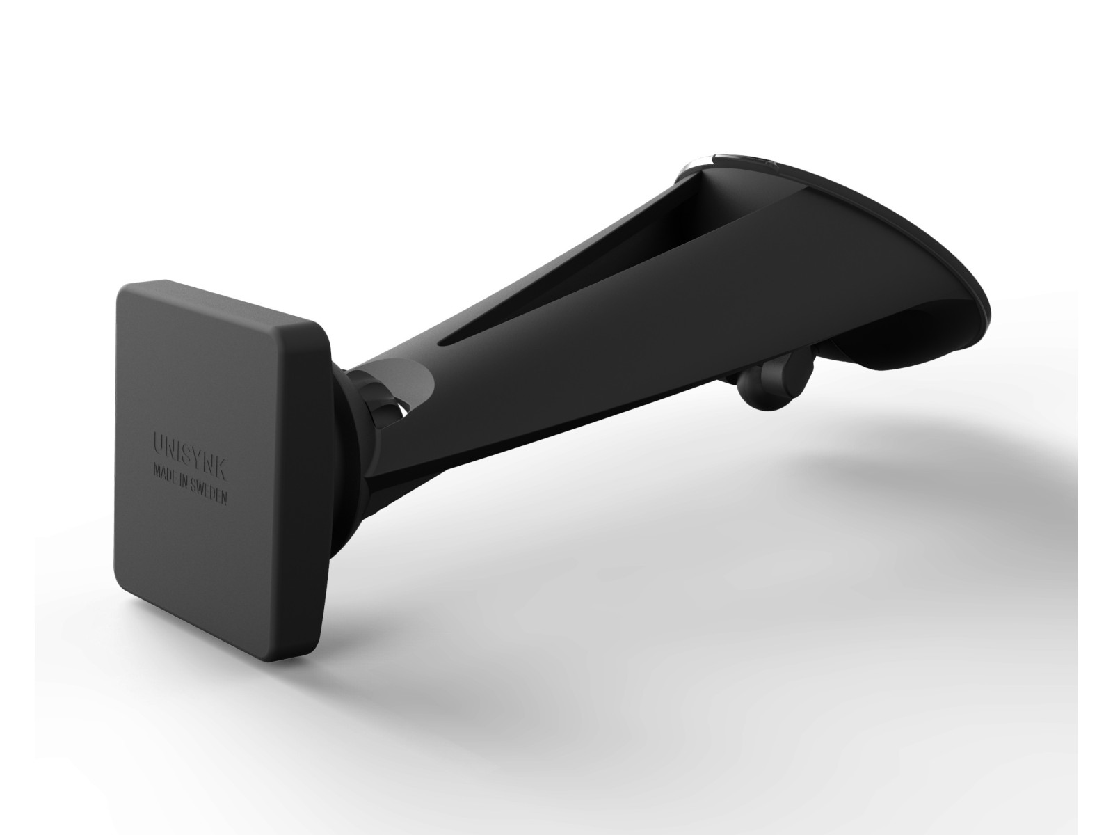 Håll din telefon nära och säker med denna svensktillverkade universella smartphone-hållare. För installation på vindrutan i alla typer av bilar. Fäster enkelt och effektivt med hjälp av en lufttät PVC-sugkopp. Två neodymmagneter håller säkert fast vilken typ av telefon som helst med den medföljande metallplattan monterad på telefonen eller med ett magnetiskt skal. Låsbar kulled för steglöst justerbar rotation och vinkel. Tillverkad av glasfiberarmerad plast för extra hållbarhet.